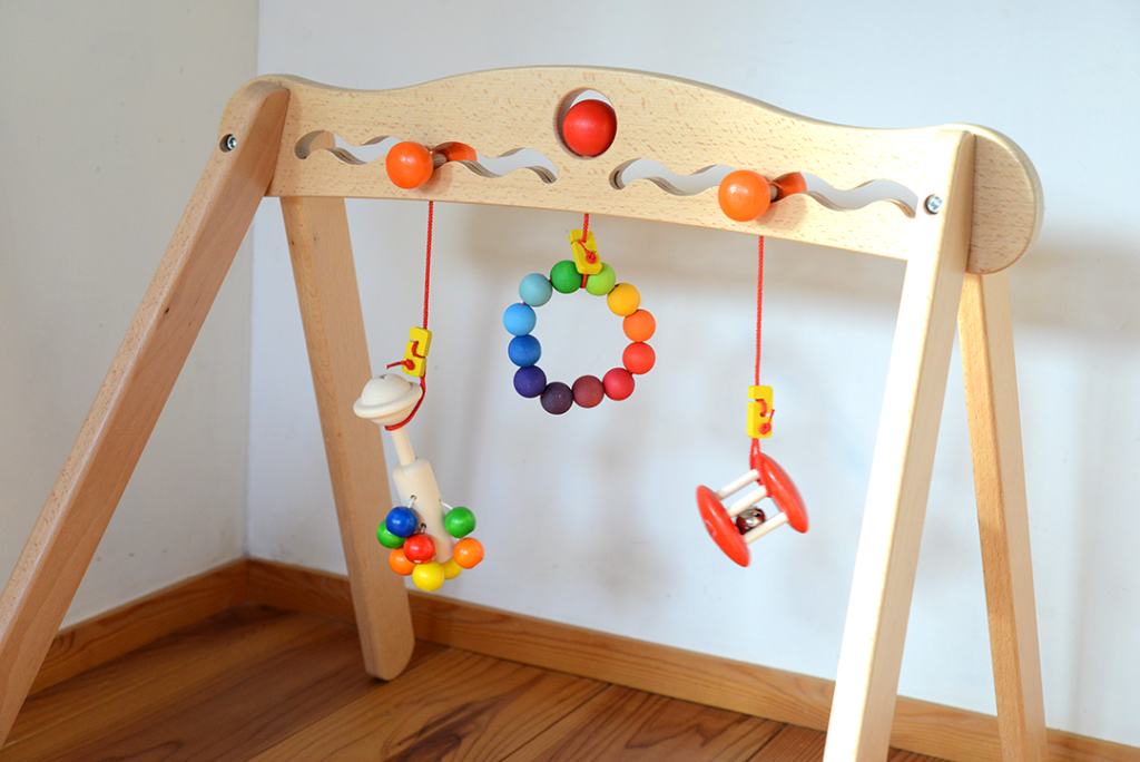 まだ物を持てない頃の赤ちゃんにおもちゃの色や形、揺れる動きを見て遊ばせます。