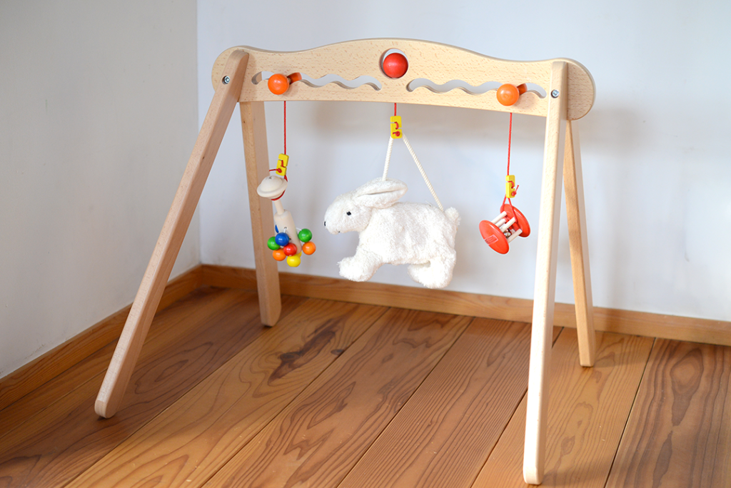 音のするもの、木、布、色、形など様々な物をかけて楽しませてあげましょう。例えば鈴の入ったもの、赤ちゃんのハンドタオル、ボールなど。様々な素材を楽しませましょう。