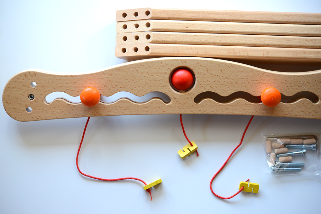 取り付け紐は3本です。両わきの紐の位置(おもちゃの位置)を変える時はオレンジ色のつまみを移動します。上部の波型のデザインは横に移動しないための波型でした。