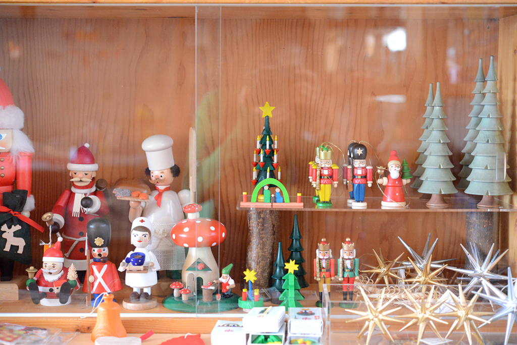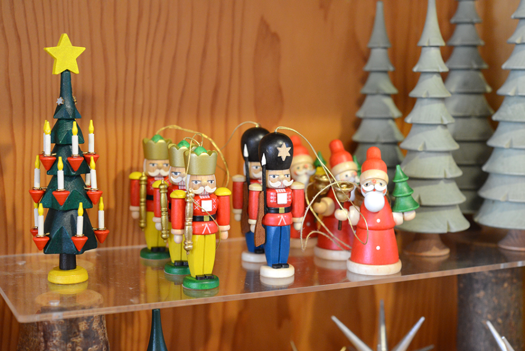 ザイフェンの森の木と職人さんの手仕事で作られた、オーナメント・るみ割り人形・煙出し人形・飾りがぎゅっと並ぶ小さなガラスケース。