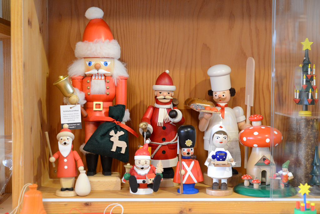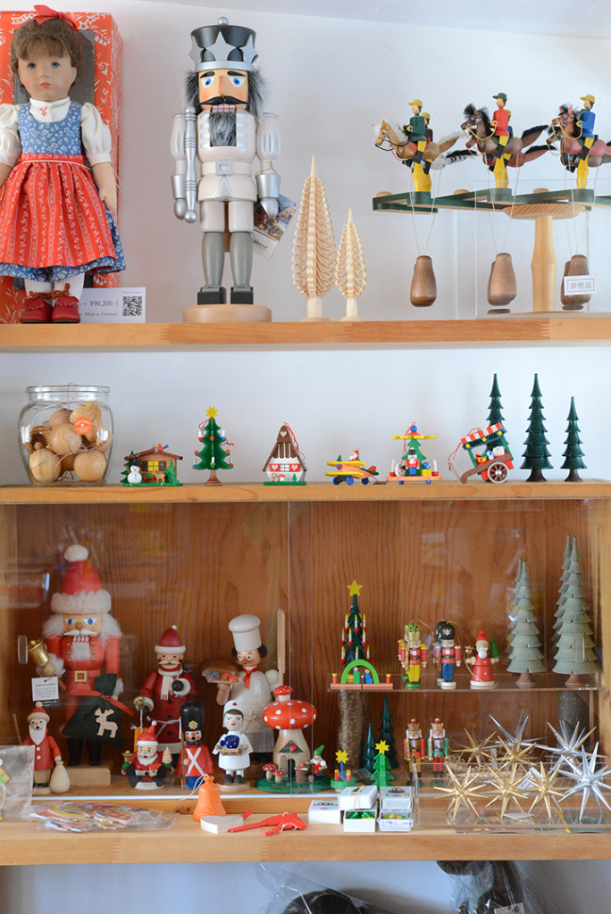 一番背の高いサンタクロースはくるみ割り人形です。他のお人形ときのこも煙出し人形です。