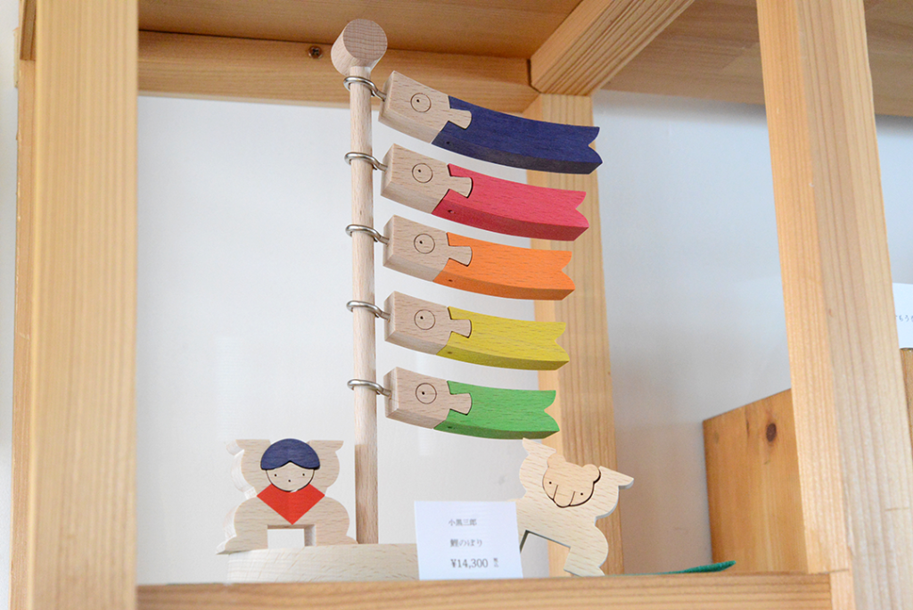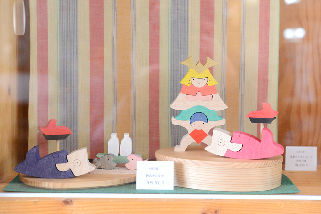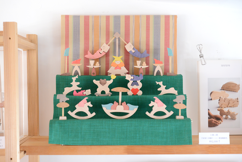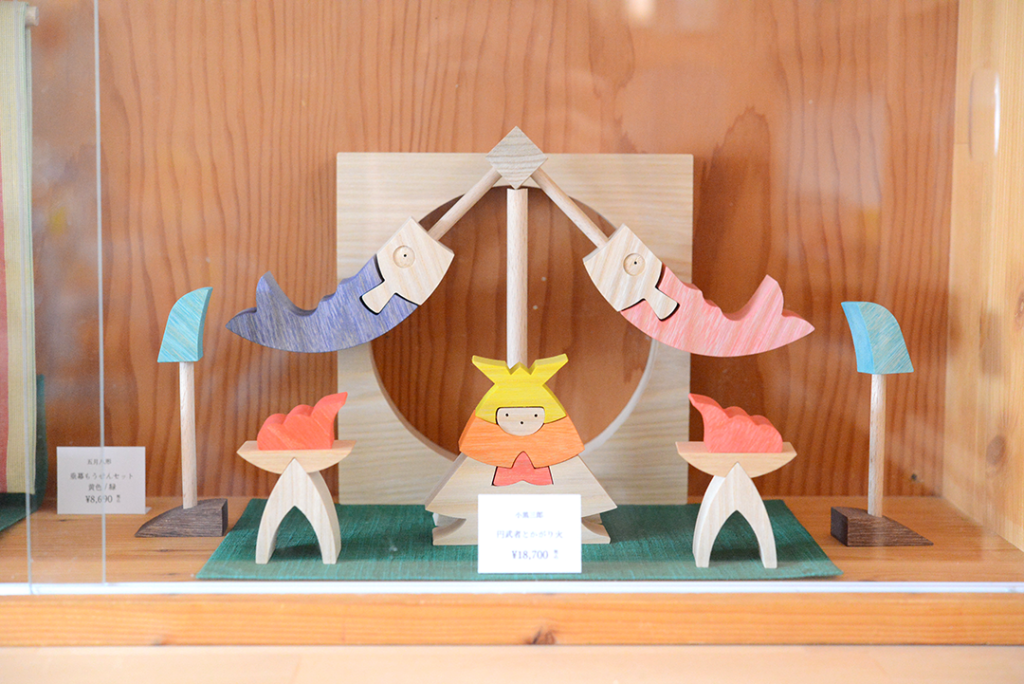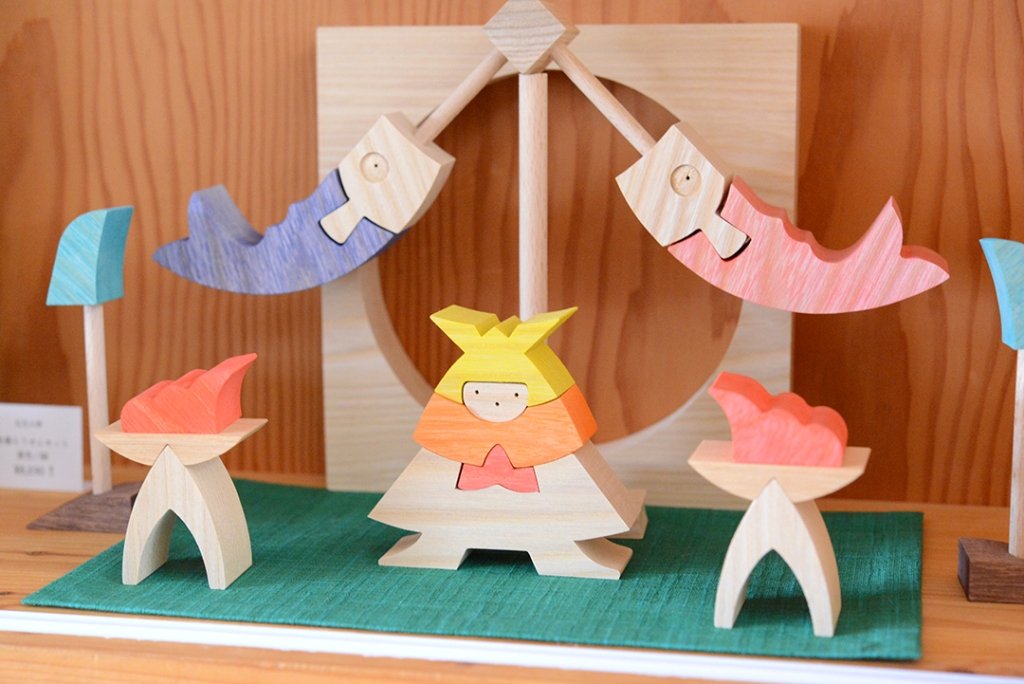 MOMO店頭に小黒三郎さんの組み木の五月人形が並びました。