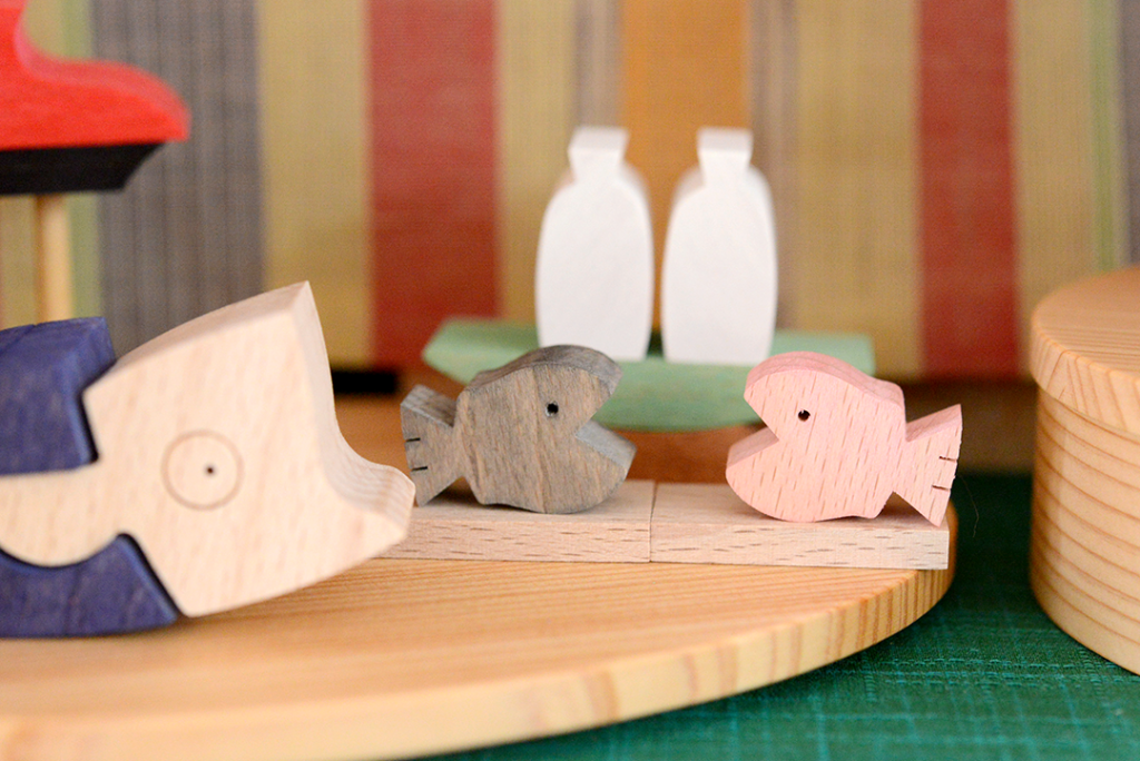 各段ごとに円形木製漆塗り容器に収まるデザインの五月人形です。鯉のぼり・兜・動物・金太郎の物語・遊びをデザインした五月人形です。小さな円を分割する細かい丁寧な手仕事です。