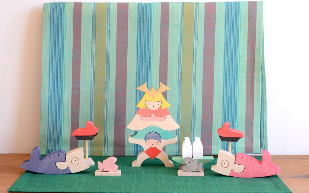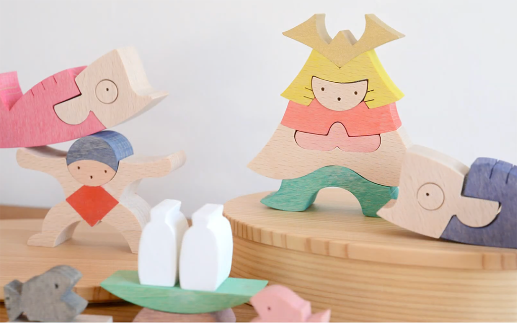 兜をかぶったかわいい武者と金太郎の組み木の五月人形、置き方を変えて、物語を楽しみましょう。金太郎さんは鯉のぼりを持ち上げて力持ち!