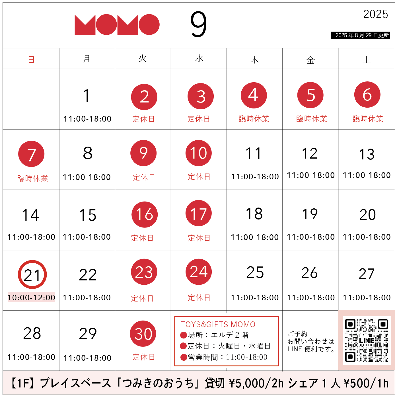 〈2025年9月TOYS&GIFTS MOMO営業日時〉