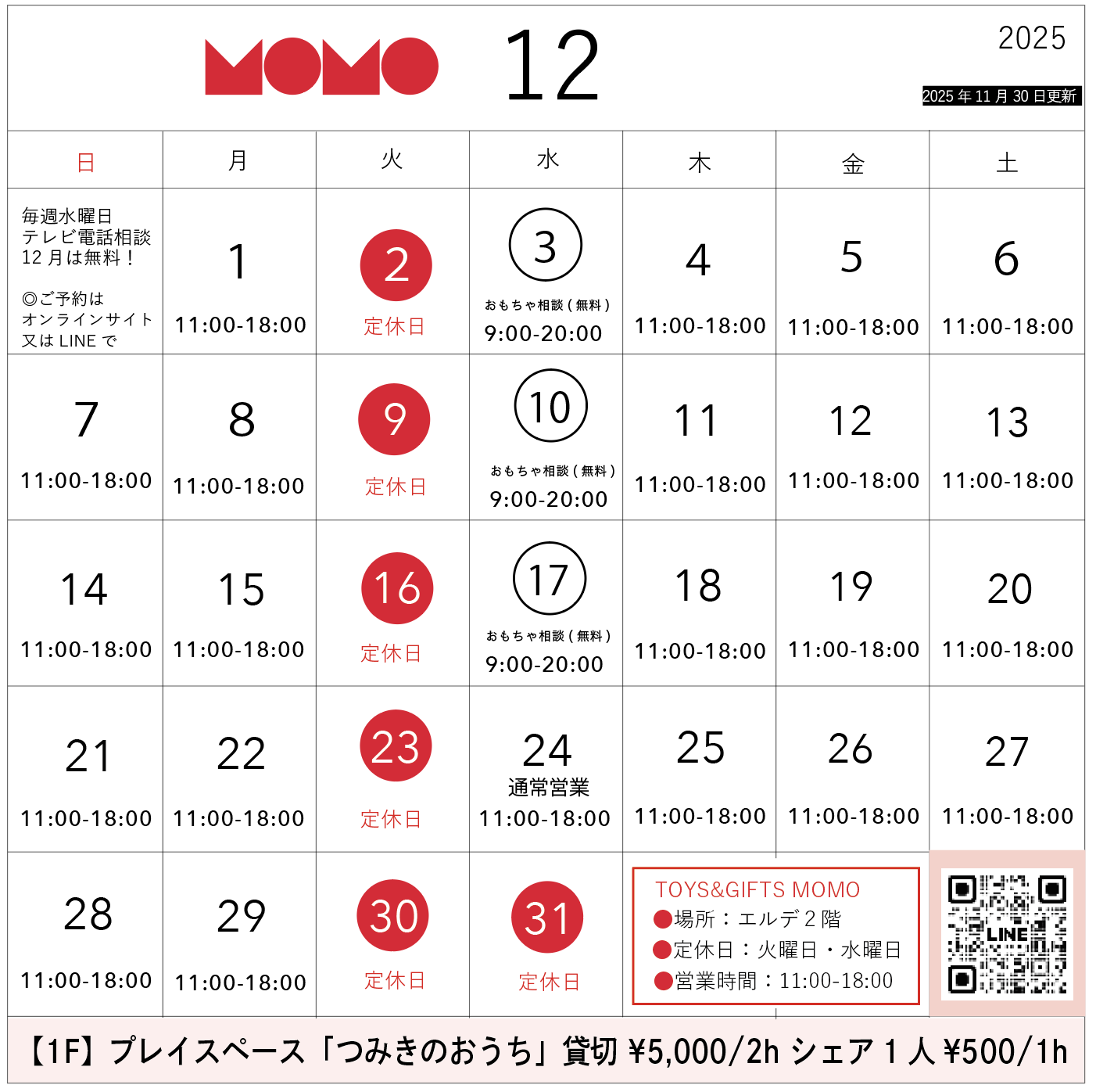 〈2025年12月TOYS&GIFTS MOMO営業日時〉